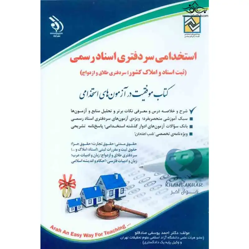 کتاب استخدامی سردفتری اسناد رسمی (ثبت اسناد و املاک کشور؛ سردفتری طلاق و ازدواج) کتاب موفقیت در آزمون های استخدامی نوشته ی دکتر احمد یوسفی صادقلو می باشد.