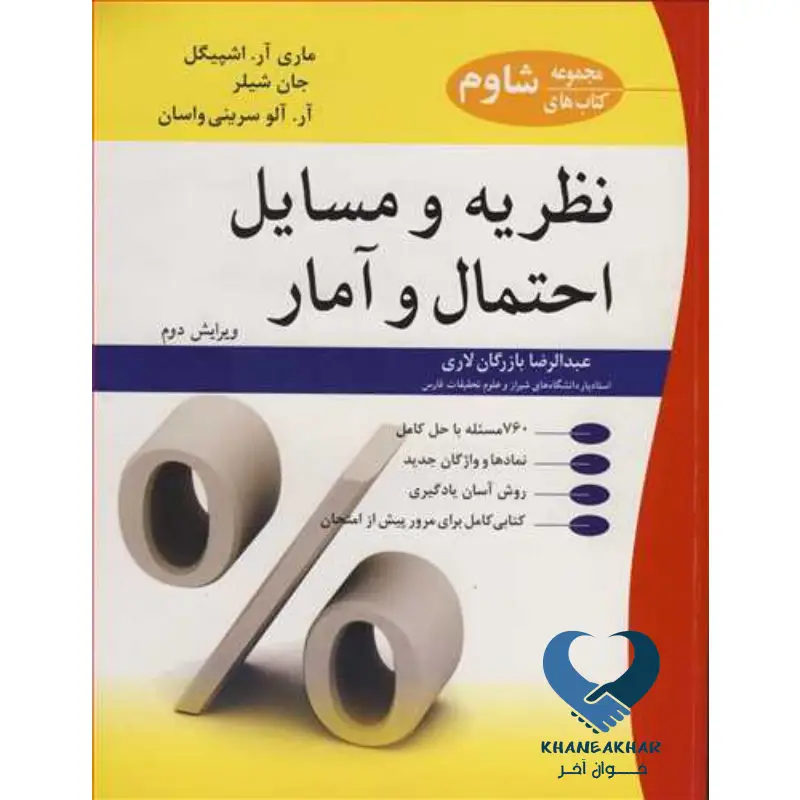 کتاب «نظریه و مسائل احتمال و آمار» تألیف ماری اشپیگل، شیلر و سرینی واسان، و ترجمه عبدالرضا بازرگان لاری توسط انتشارات آییژ، یکی از منابع جامع و کاربردی در زمینه احتمال و آمار است. این کتاب به شکل یک منبع کمک آموزشی طراحی شده و شامل توضیحات نظری همراه با مسائل و تمرینهای متنوع است.