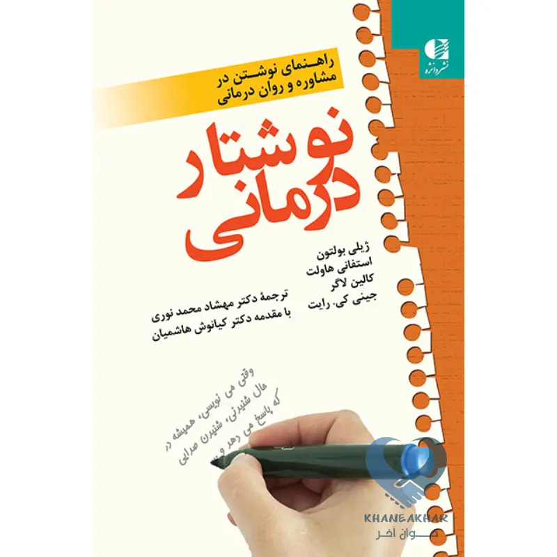 کتابی که در پیش رو دارید به نام نوشتار درمانی (راهنمای نوشتن در مشاوره و روان درمانی). نوشته ی ژیلی بولتون، استفانی هاولت، کالین لاگر و جینی کی. رایت با ترجمه دکتر مهشاد محمدنوری با مقدمه دکتر کیانوش هاشمیان که انتشارات دانژه آن را چاپ و روانه بازار کرده است.